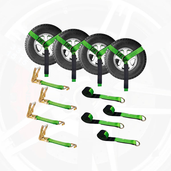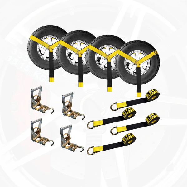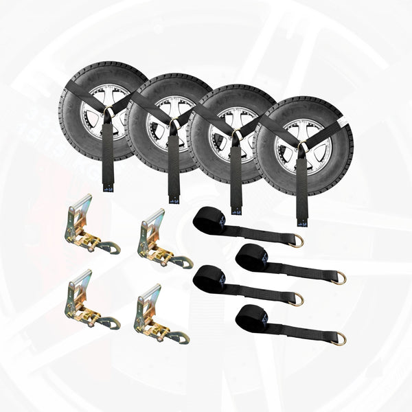 support from both sides. Over-the-tire straps wrap over the tire in a single loop. Wheel nets provide more surface coverage, ideal for high-value or luxury vehicles.