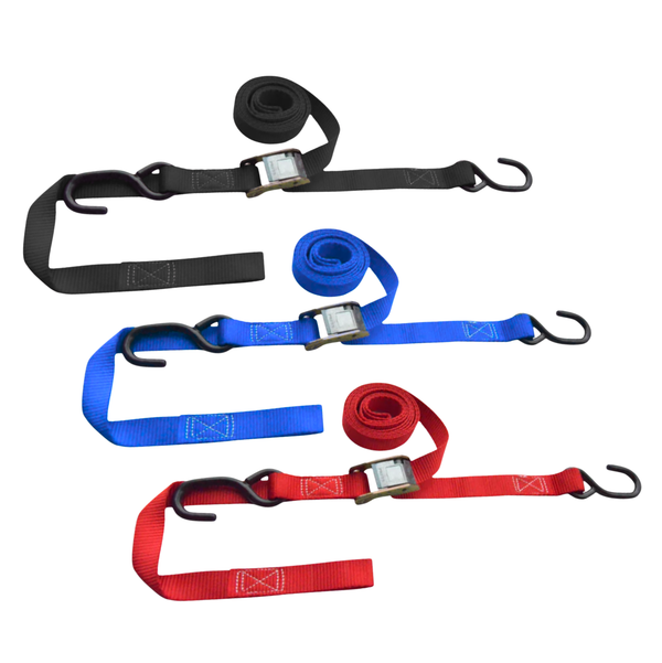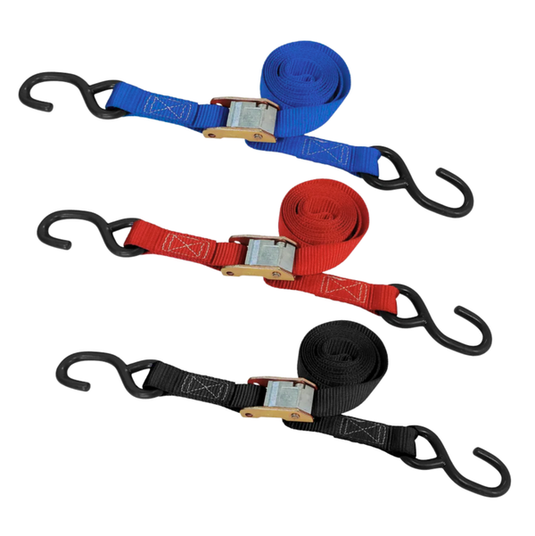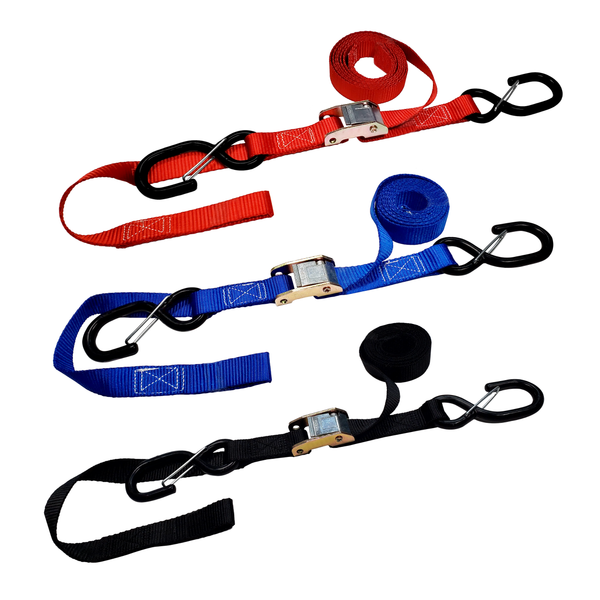 🟢 S Hook Cam Buckle Straps - Tie-down straps with S-shaped end hooks and a cam buckle for manual tensioning. Preferred for motorcycles, ATVs, and lighter gear due to their ease of use and safety.