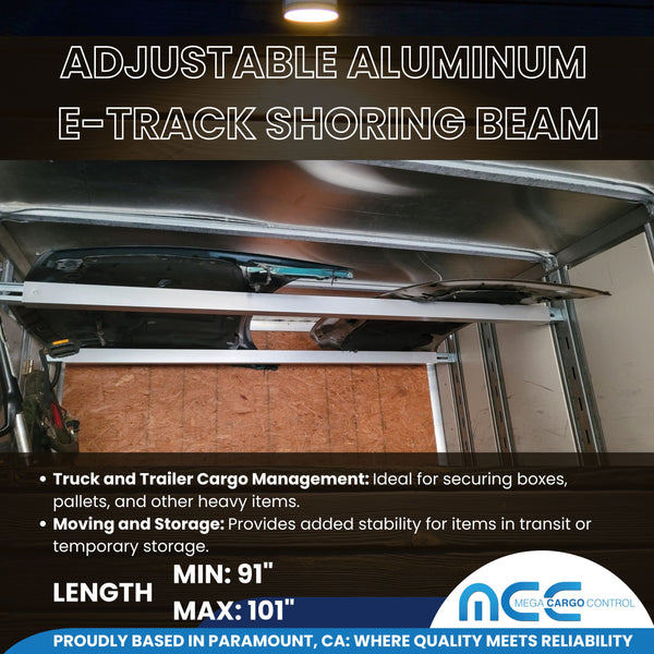 E-Track shoring beams are heavy-duty adjustable bars that attach to E-Track rails inside enclosed trailers, box trucks, and vans. Unlike standard load bars (also called cargo bars or lock bars), which rely on tension against walls, shoring beams lock securely into E-Track systems, providing superior stability and weight distribution.