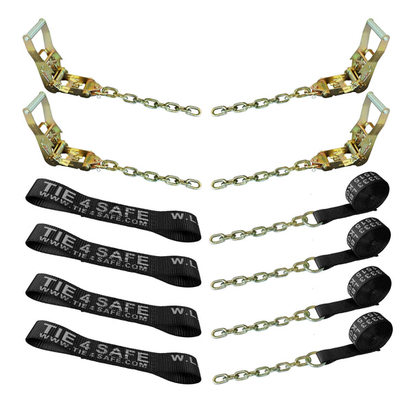Lasso chain straps are the backbone of the 8-point system, featuring a 2-inch-wide, 14-foot-long polyester webbing strap with a heavy-duty chain loop at one end. This lasso-style design wraps securely around tires, creating a non-slip grip that won’t loosen during transport.