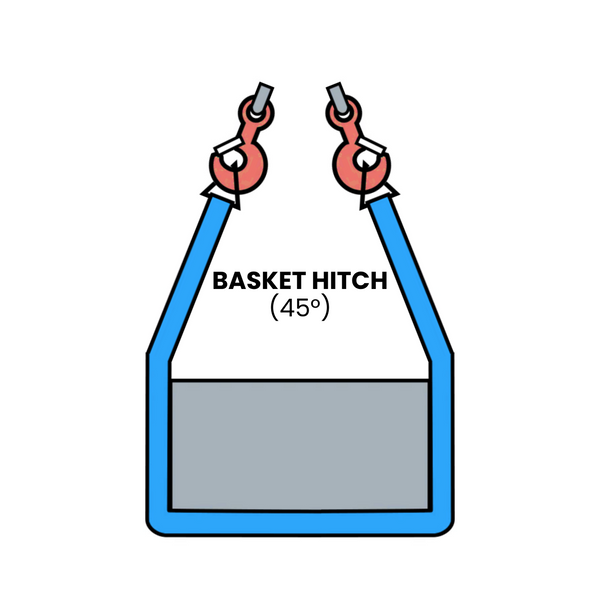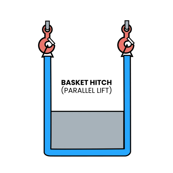 A basket hitch cradles the load from below, with both ends of the sling attached overhead. This distributes weight evenly across two legs, effectively doubling the sling’s capacity compared to a vertical hitch.