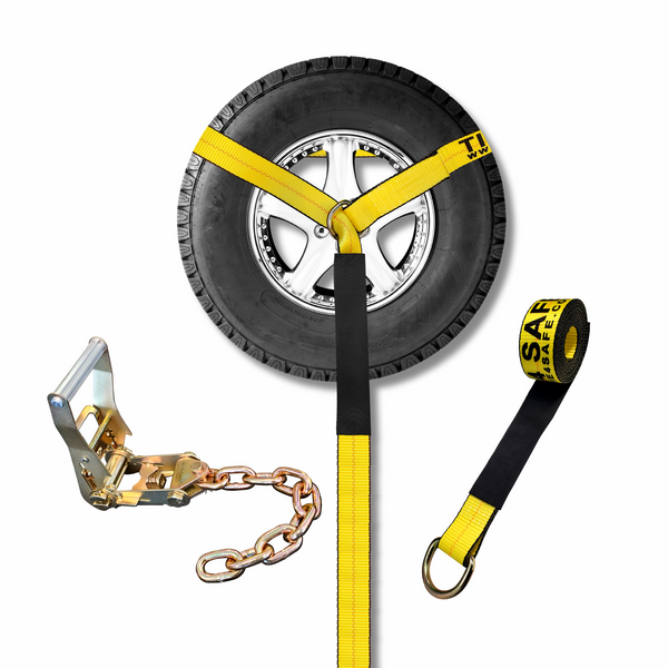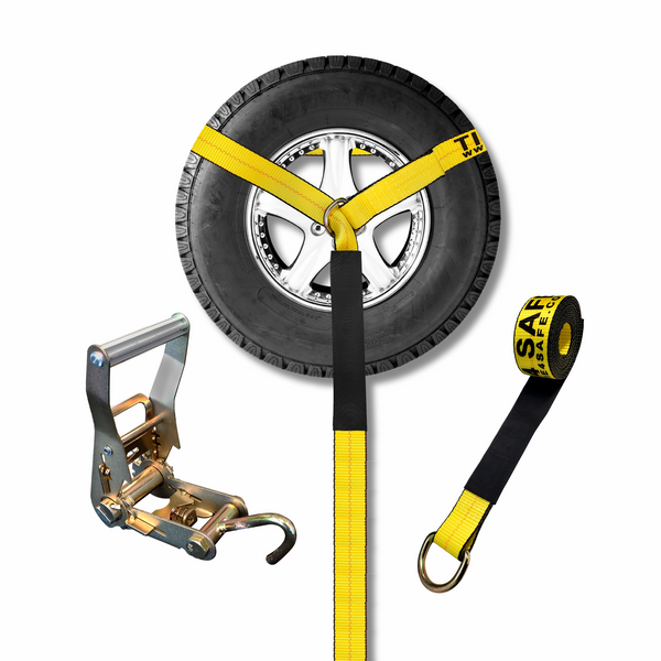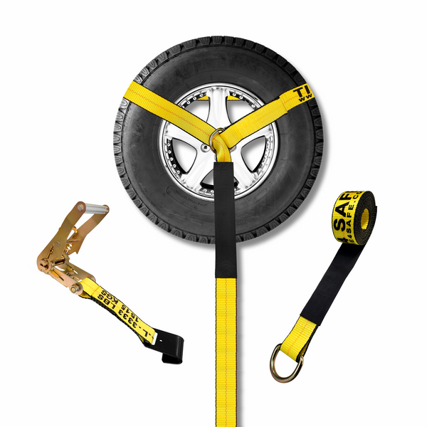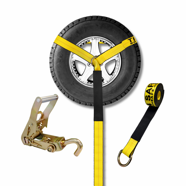 Over-Tire Straps are designed for vehicles where tire-based restraint is preferred. These straps feature ratchet buckles, sliding rubber blocks, and either wire J-hooks or 360° swivel J-hooks.