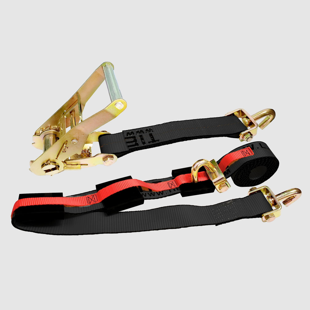 Auto tie downs are heavy-duty straps engineered specifically for vehicle transport. Unlike standard ratchet straps, they are constructed from industrial-grade polyester webbing, feature protective sleeves, and include specialized end fittings for secure attachment to axles, tires, or chassis points.