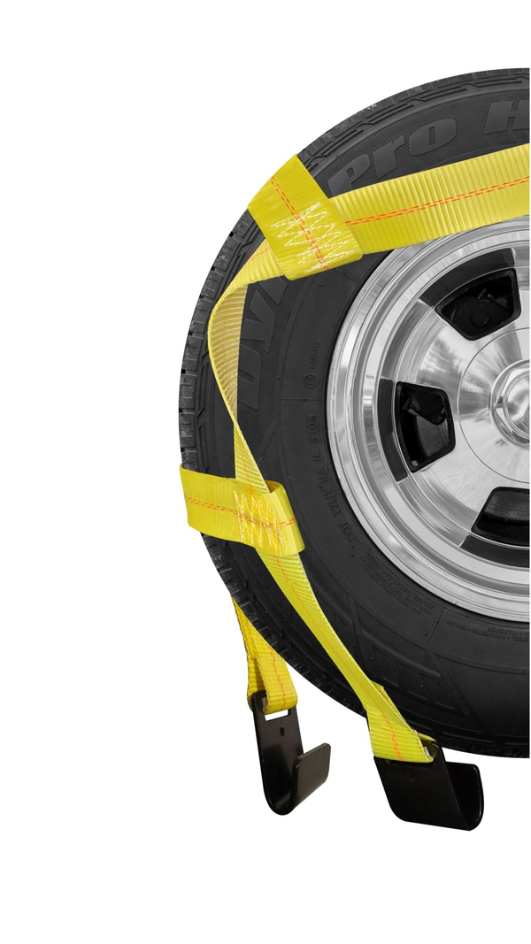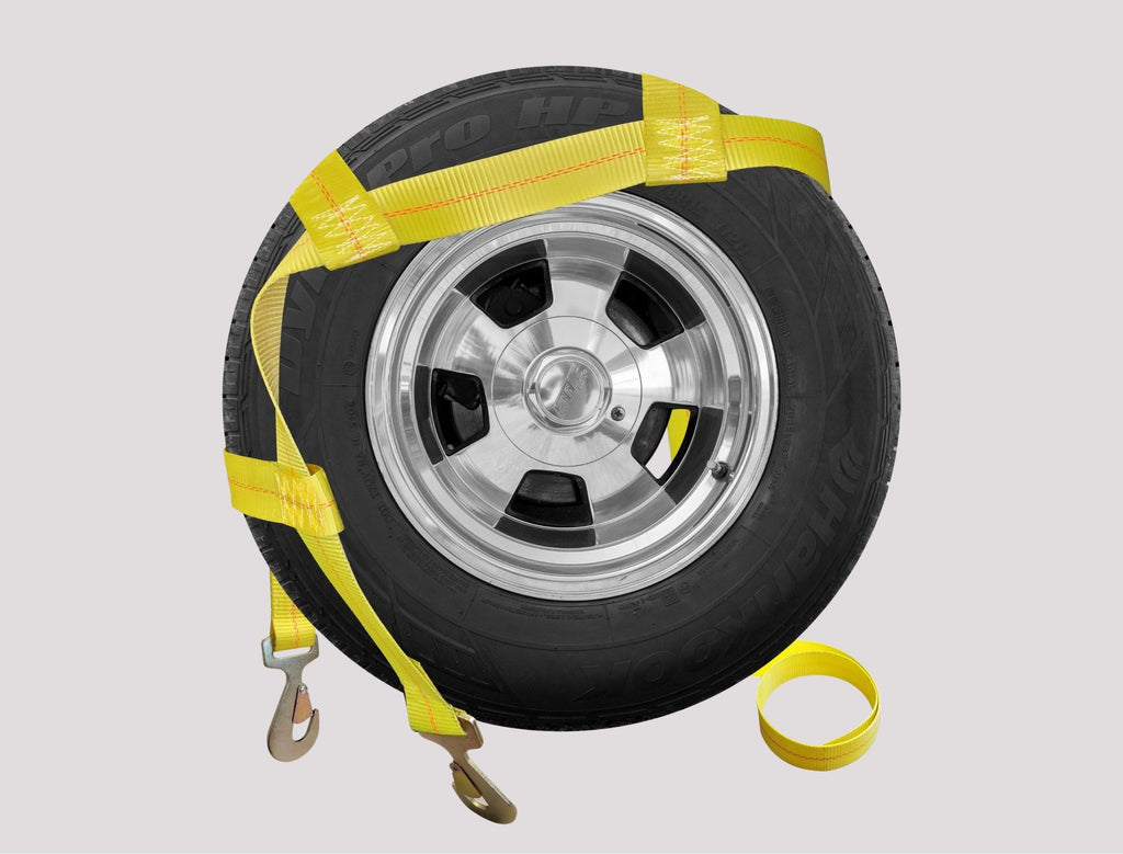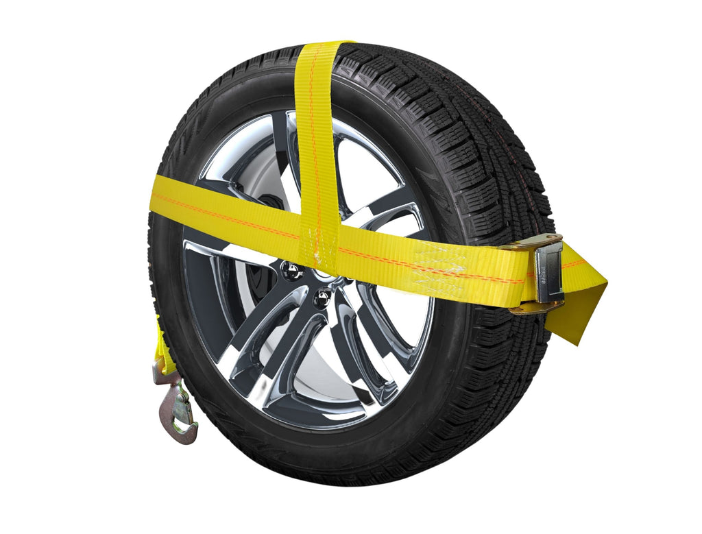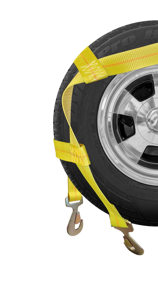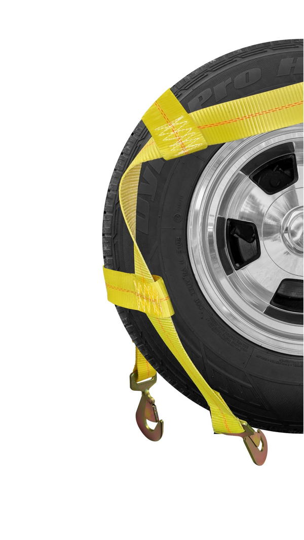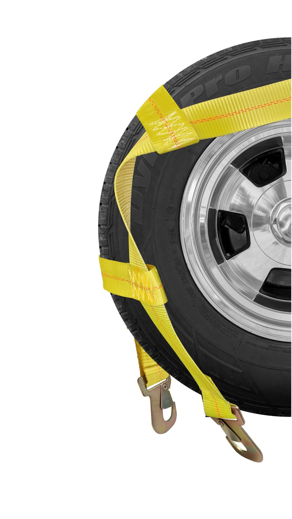 Tow Dolly Basket Straps, also known as Tire Bonnet Straps, are over-the-wheel tie-down assemblies designed to secure vehicles safely by cradling the tires instead of attaching directly to the frame. This method is widely regarded as safer, more stable, and gentler on vehicles, as it minimizes suspension bounce and reduces stress on the frame. The straps fit over the tire like a “basket” or net, creating a wide