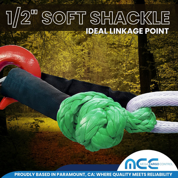 Synthetic soft shackles are high-strength, lightweight recovery tools made from advanced synthetic materials designed to handle extreme loads while being gentle on your equipment. Unlike traditional steel shackles, which are heavy, bulky, and prone to damaging vehicles, soft shackles are engineered to provide exceptional strength without the drawbacks of metal. The 1/2 inch x 22 inch size is perfect for most recovery operations, offering a balance of strength and flexibility. The protective sleeves included with Mega Cargo Control’s soft shackles ensure durability and longevity, even in harsh conditions.